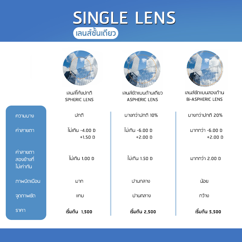 1. เลนส์ชั้นเดียว (single lens) คือเลนส์ที่มีค่ากำลังสายตาเพียงค่าเดียวโดยสามารถเพิ่มสายตาเอียงได้ โดยแบ่งเป็น 3 ชนิดดังนี้