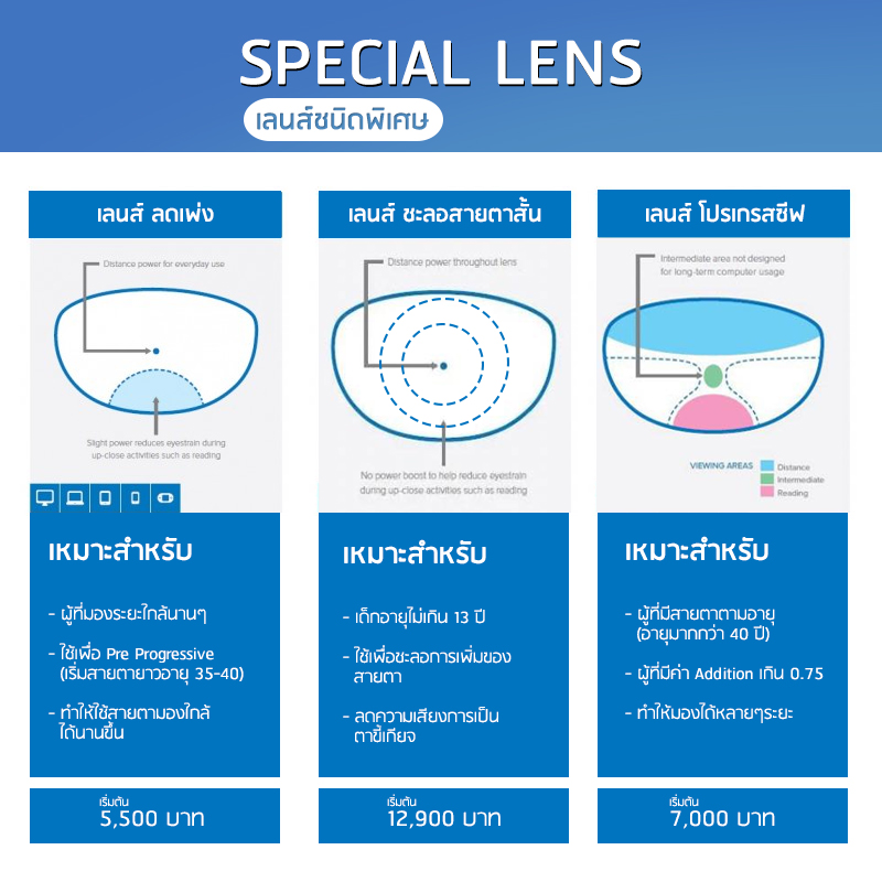 หรือเลนส์สั่งตัดพิเศษเป็นเลนส์ที่ทำขึ้นมาเพื่อตอบสนองต่อการแก้ไขปัญหาเฉพาะด้านของแต่ละคนดังนั้นหากเลือกชนิดของเลนส์พิเศษได้ไม่ตรงกับการแก้ปัญหาอาจทำให้เกินความไม่สะบายต่อแก่ผู้สวมใส่ได้