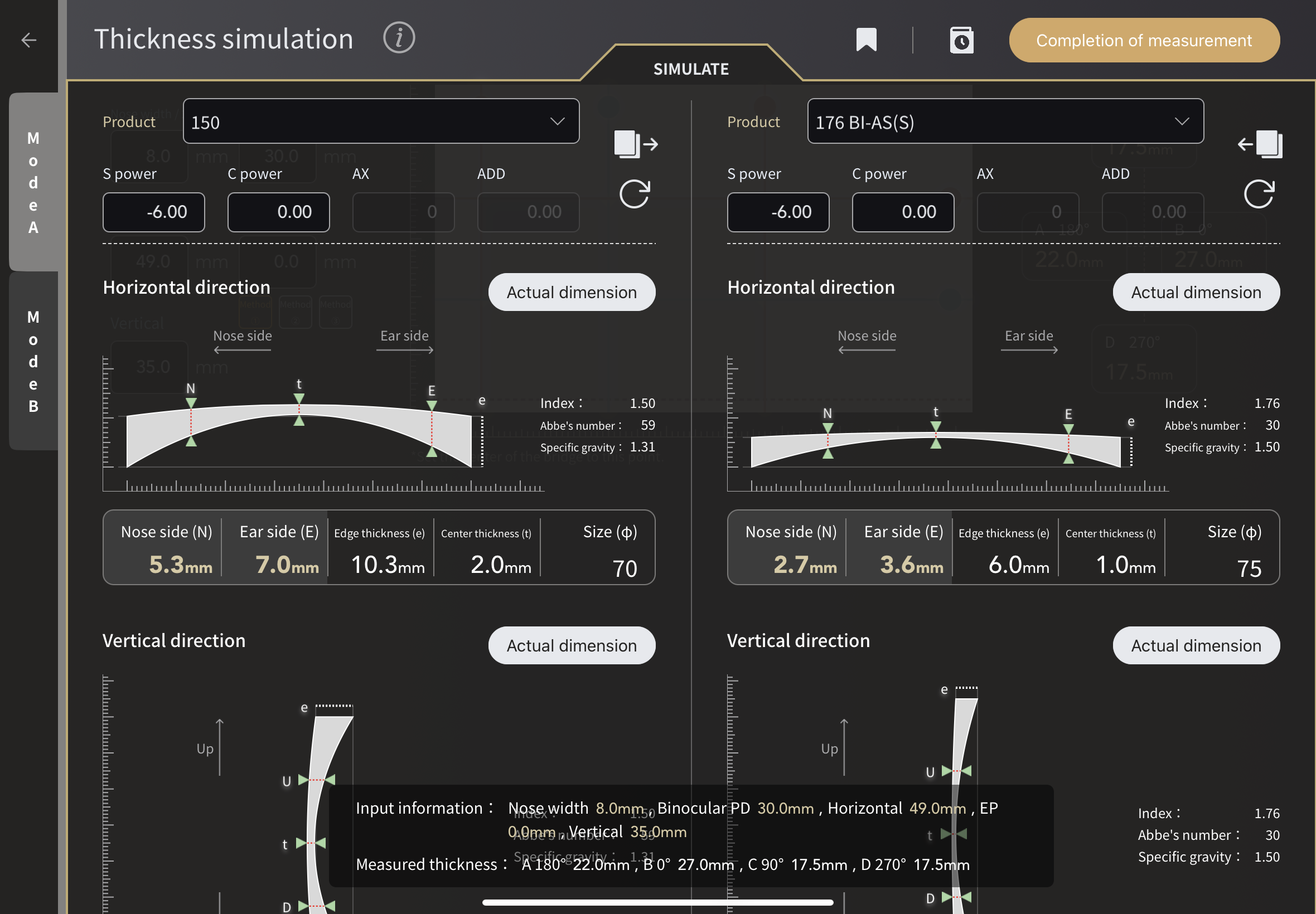 ( ในภาพแสดงถึงความหน้าของเลนส์เมื่อใส่กับกรอบแว่นขนาด SIZE 49 ด้วยค่าสายตา -6.00 D )